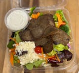 Lamb meat and feta cheese atop of spring mix and romain heart
